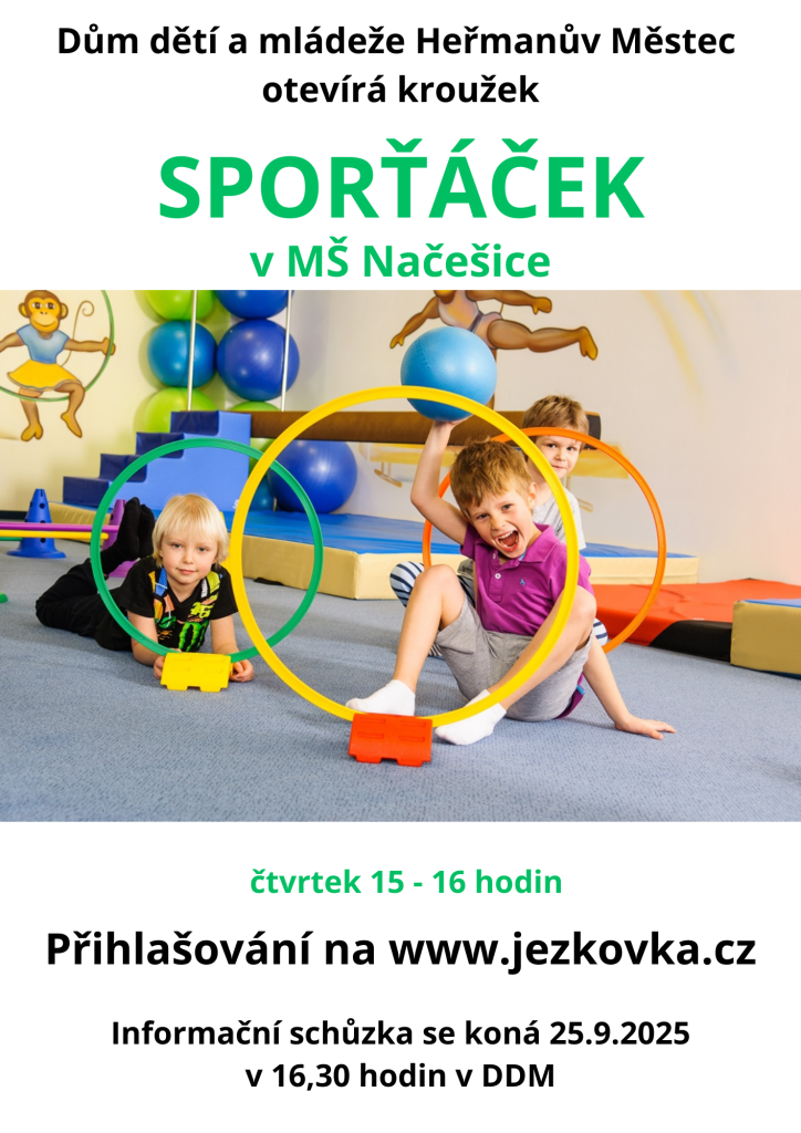 V prostorách mateřské školy se bude konat kroužek "Sporťáček", pořádaný ve spolupráci s DDM Ježkovka, v případě zájmu děti přihlašujte na webu www.jezkovka.cz, a to od 2.9.2025. Počet míst je omezený.